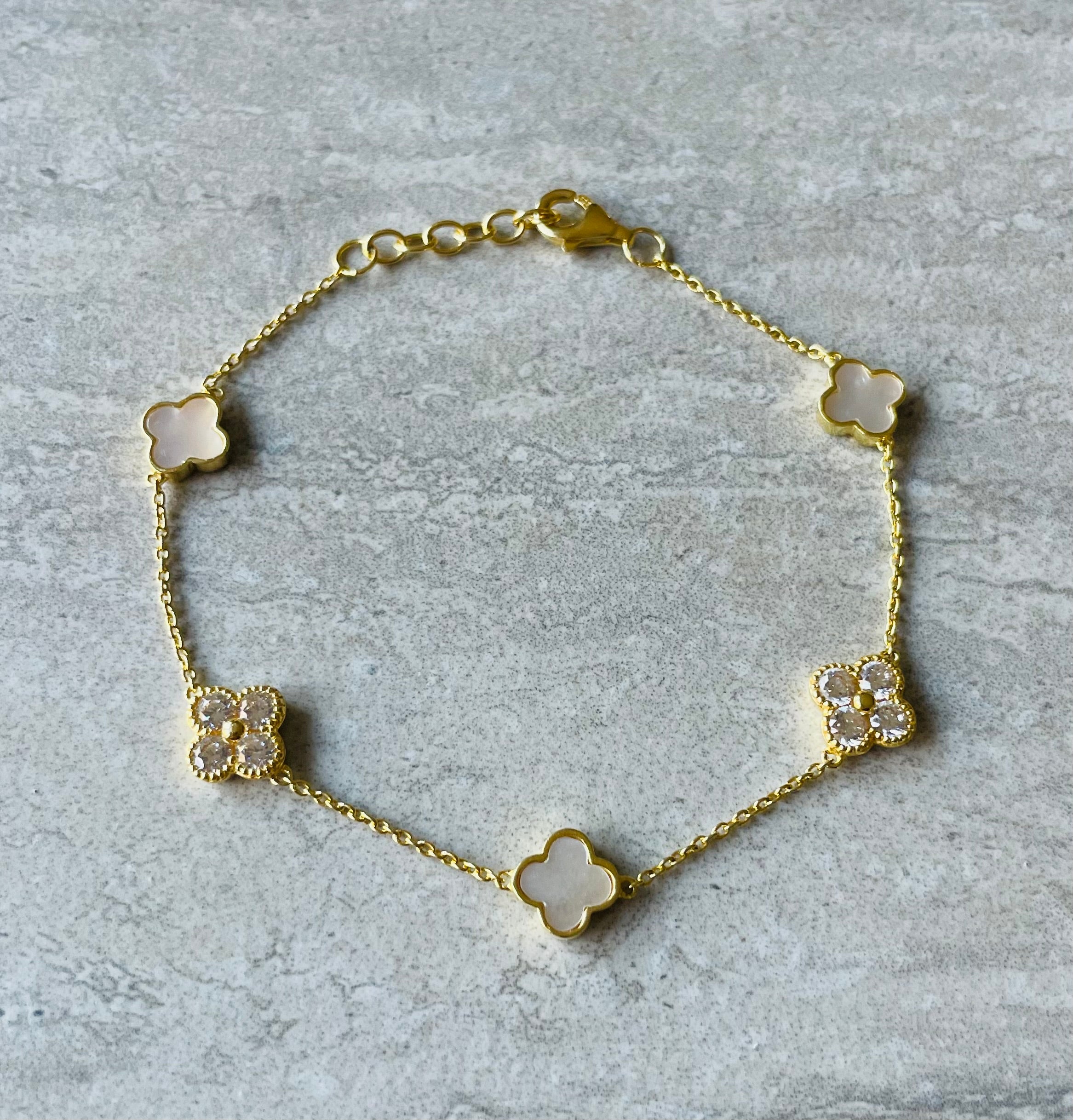 Exquisite Gold Bracelet with five quatrefoil (four petal flower)charms set around a fine chain all beautifully detailed with CZ and 'mother of pearl.' Effortlessly chic this stunning bracelet is perfect as a solo piece or mixed with other fine chains, designed to sit snugly on the wrist. Matching necklace available.