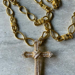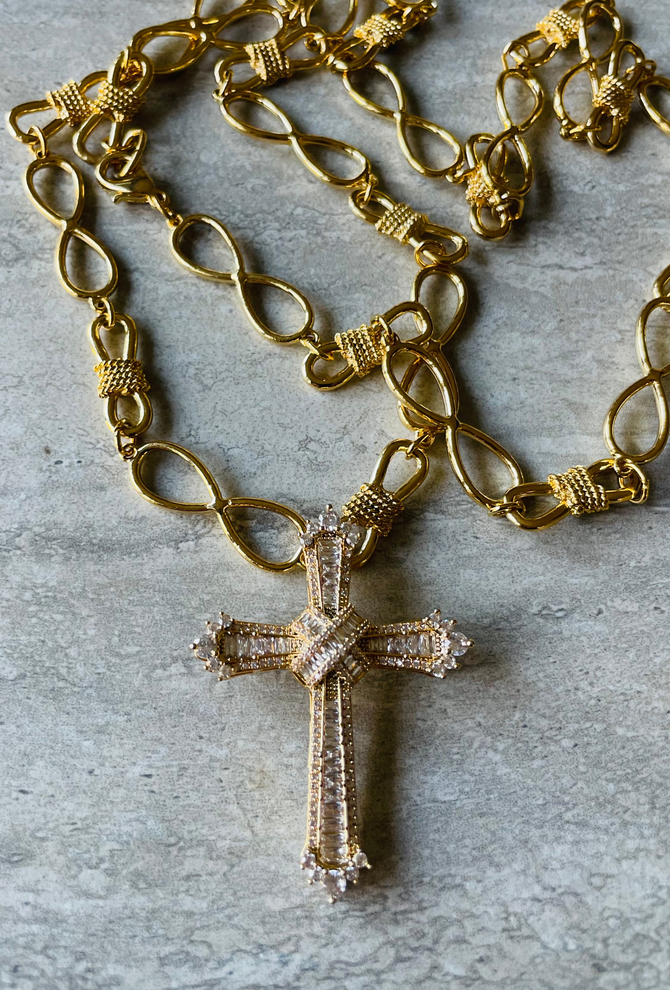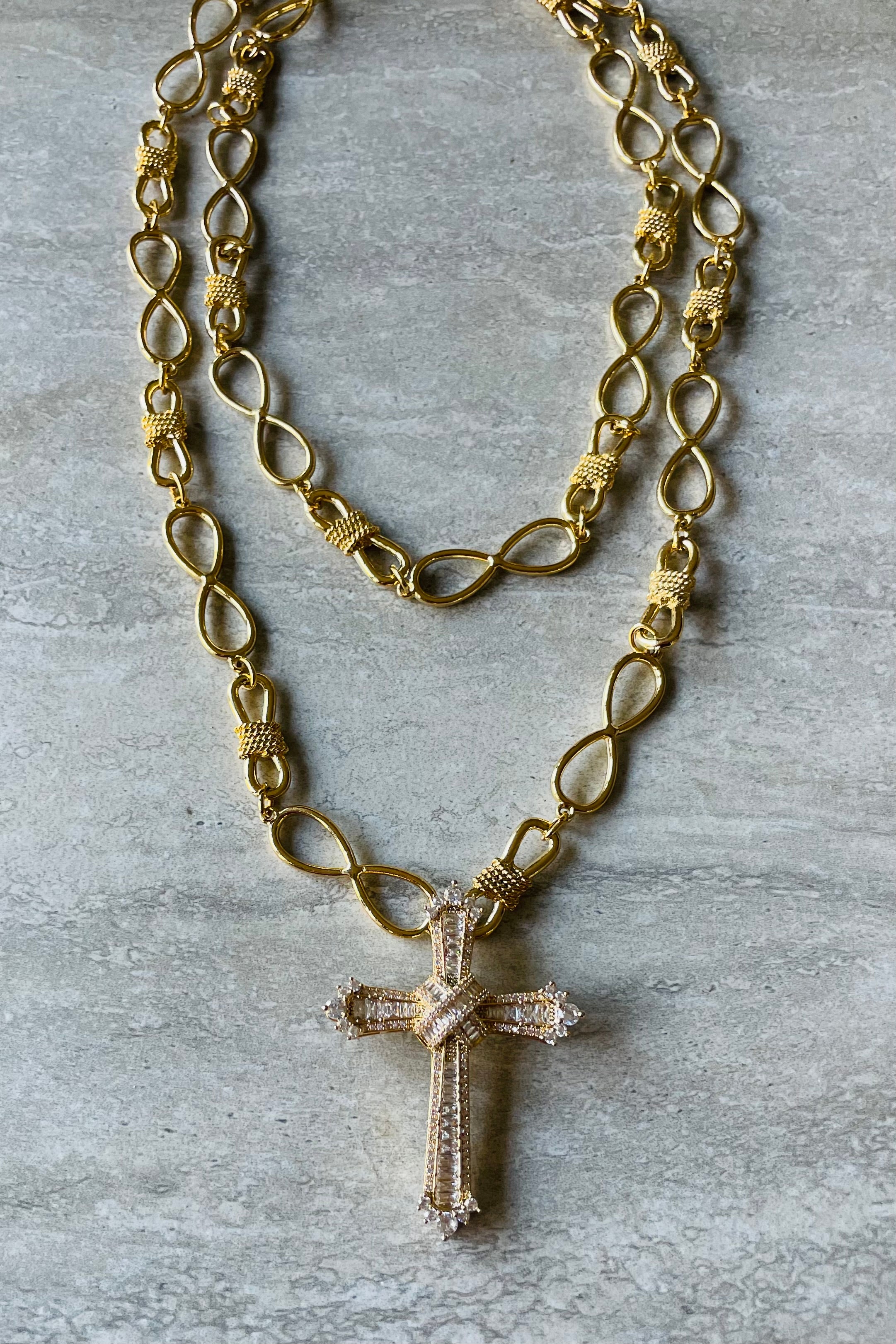 The incredible gold Camile is an extra long infinity link chain with a fabulous byzantine cross pendant, the necklace can be worn extra long or wrapped around for a shorter more maximalist look, whichever way it's a showstopper with all the luxe design vibes.