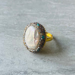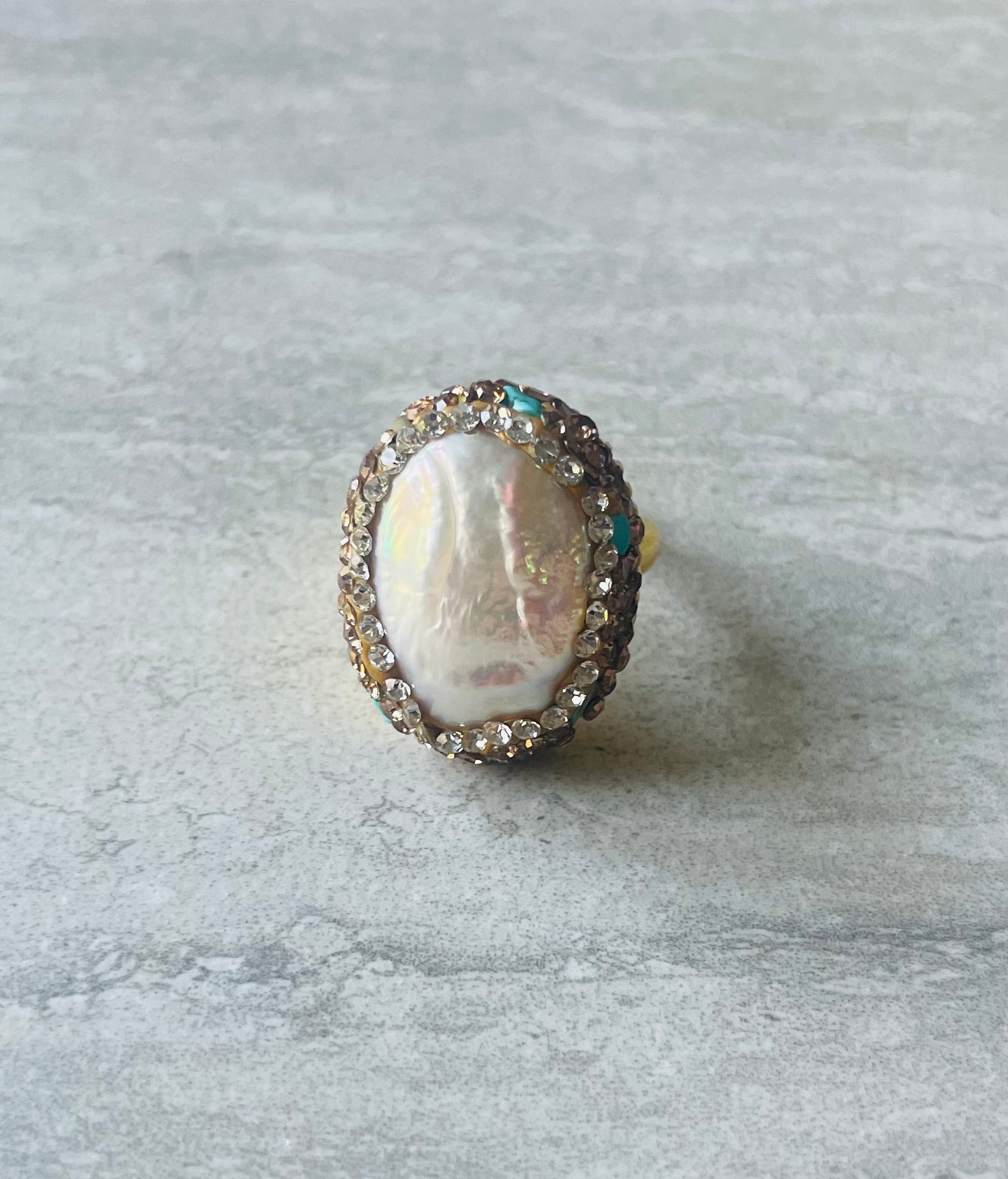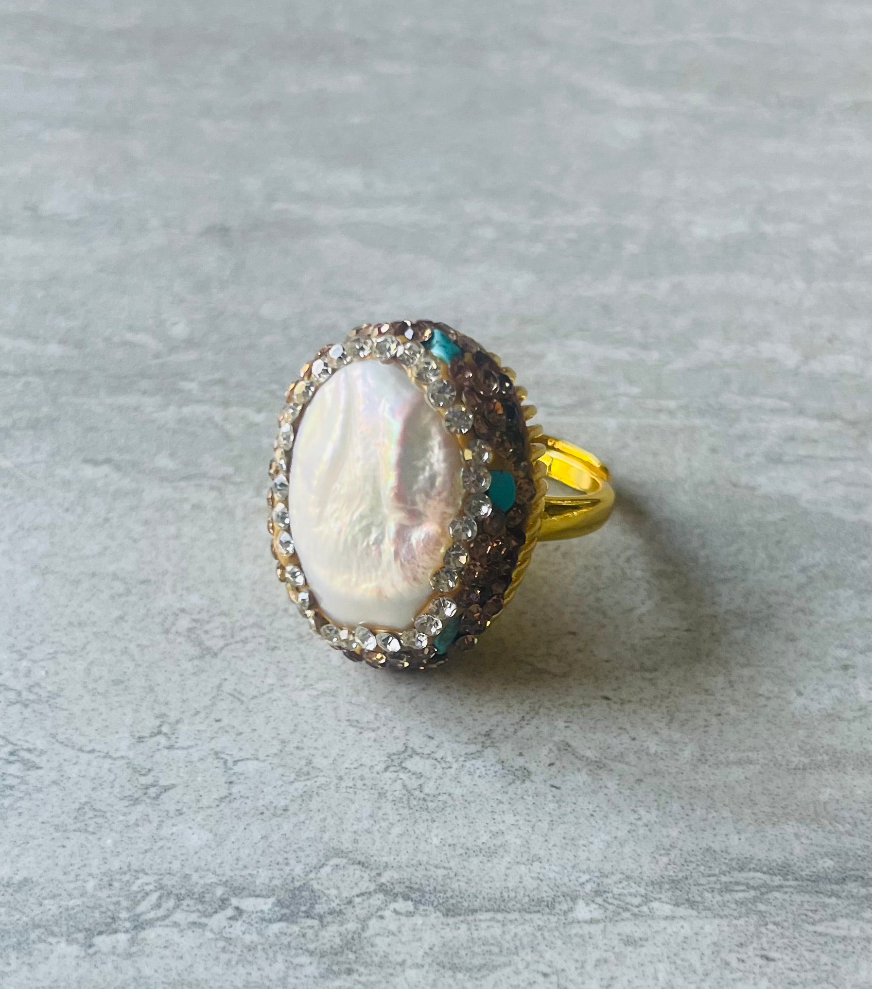 The beautifully decadent Gaia Ring with a dazzling freshwater pearl oval lavishly detailed with gold and turquoise crystals, a wonderful statement ring you'll love, can be adjusted to wear on your chosen finger.