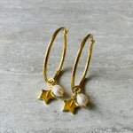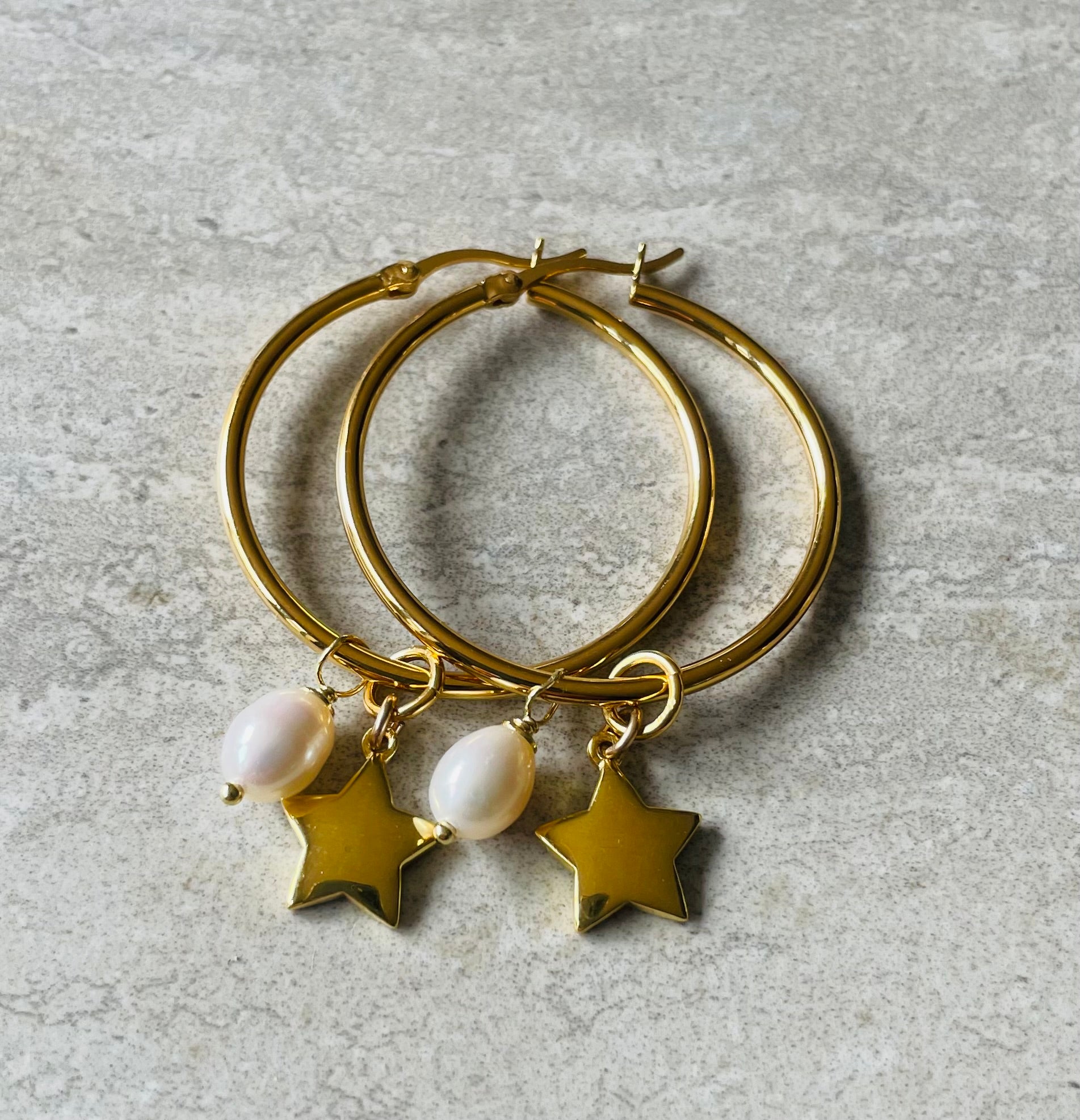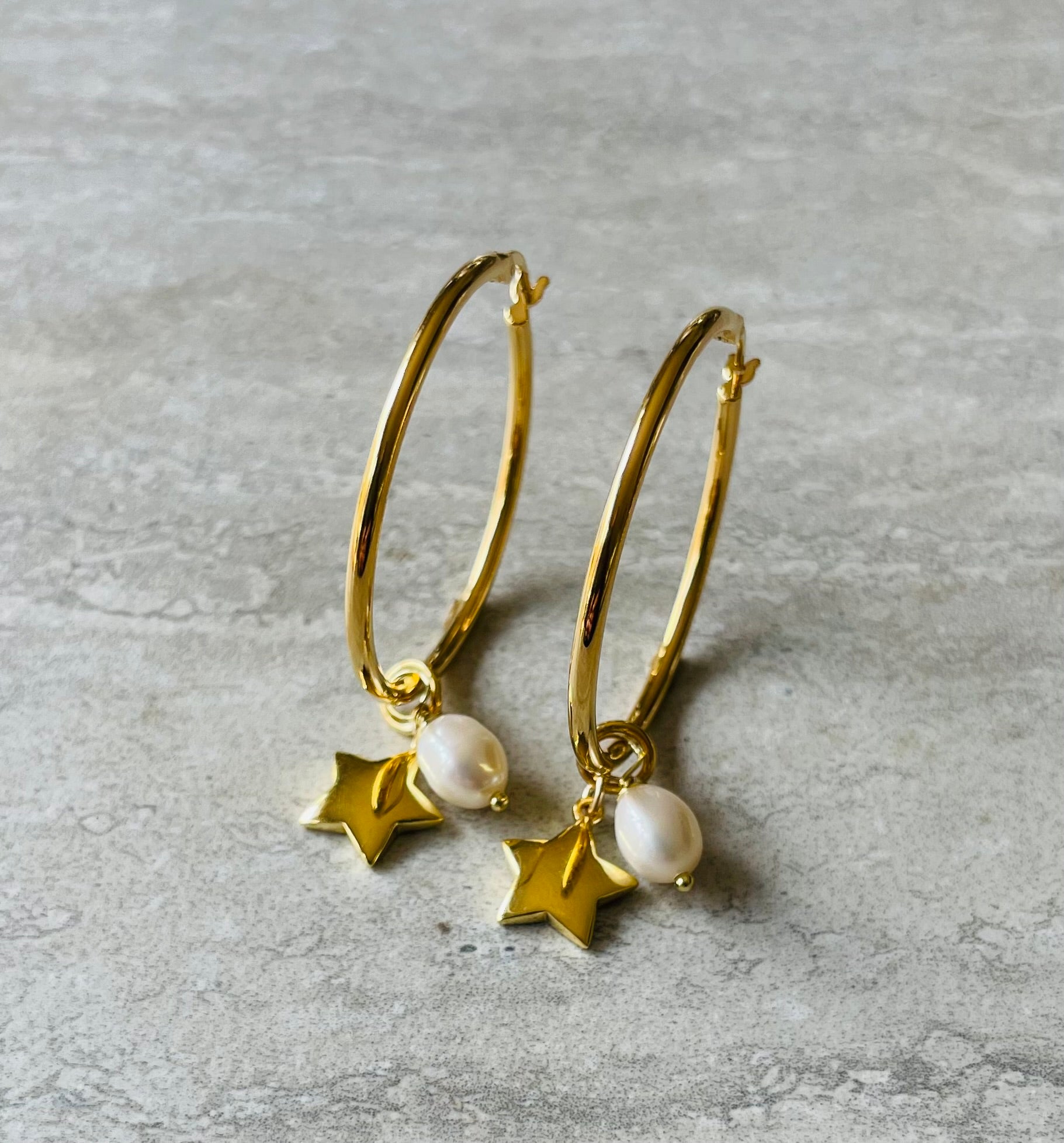 The Jeanie Star Hoops in Sterling Silver or Gold Vermeil, named after beautiful Jeanie @everydaysugar, the design offers total versatility with removable charms, hoops have a polished finish with a solid Star and Freshwater Pearl on each Earring.